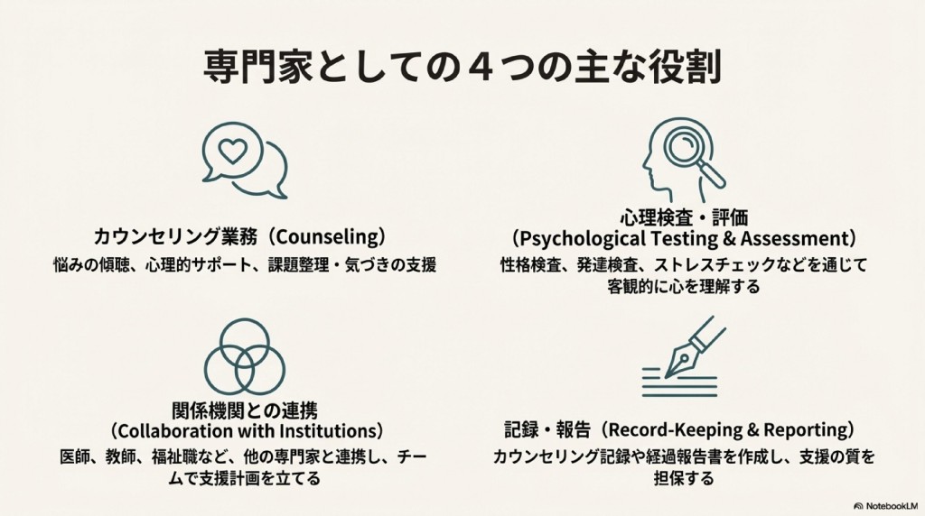 幅広い分野で心理支援を行う専門家として位置づけられています。