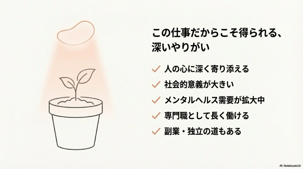 心のケアが近年とても重要になってきている現代にはとてもかかせない職業だと感じます。それだけに中途半端の知識と強要では太刀打ちできない。メンタルが弱いとこの仕事を続けられないというデメリットもあるかと思います。メンタル強者で知識武装をして心に寄り添うお仕事!